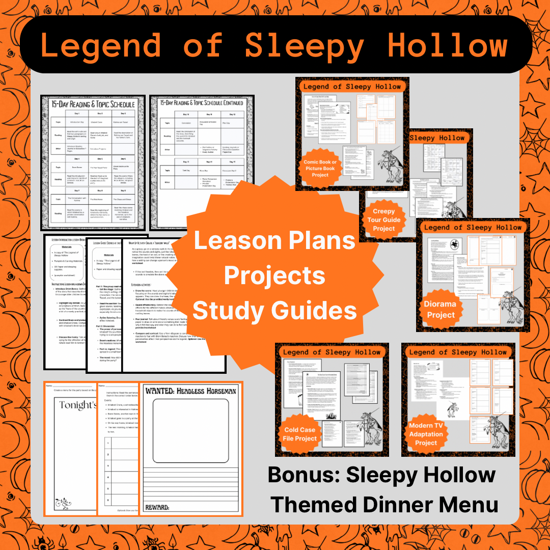 The learning doesn’t stop once we finish reading The Legend of Sleepy Hollow. Students will then complete a study guide tailored to their age level, which correlates with the final test at their respective level. To celebrate the end of the unit, students will watch Disney’s The Legend of Sleepy Hollow and compare it to Irving’s text with a comparison guide. If that wasn’t enough, students can also let their creativity shine in one of the FIVE available projects with this unit. Elementary students can make a diorama of their favorite scene. At the same time, middle schoolers can choose to retell the story in a comic book or picture book remake, or they can become Sleepy Hollow tour guides with the Creepy Tour Guide Project. High schoolers can be challenged to build a Cold Case File for the missing Ichabod Crane or create a Modern TV adaptation.
